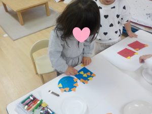 最初の頃は指に取れるだけのりを取る子もいましたが、今では「このくらいかな」等のりを取る量を考えながらのりを使っています。保育者にアドバイスをもらいながら自分の中でたくさん試行錯誤をし、少しずつ適量が分かってきているのでしょうね。