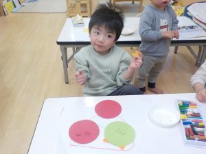 1つや2つのつのだけではなく、たくさんのつのを貼る子もいて、自分の思う鬼が完成すると、笑顔で「鬼完成!」と嬉しそうでした。