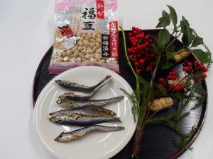 2月は節分をテーマに、大豆、ヒイラギ、いわしを飾りました。