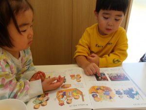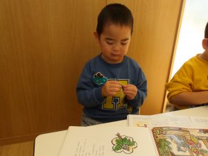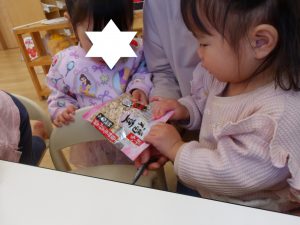 事前に節分について絵本で見た内容を再現しようとしていました。