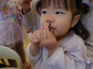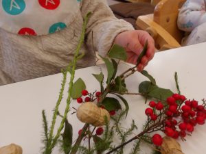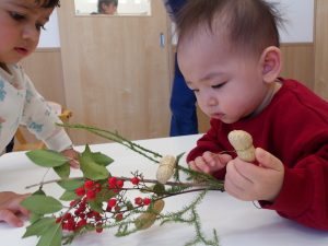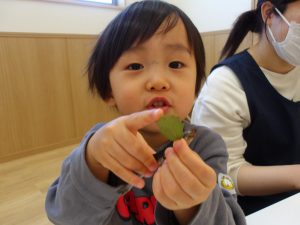 そら組のお友だちは、ヒイラギの葉とイワシの頭を一生懸命くっつけようとする姿がありました。