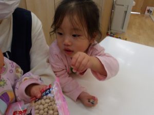 豆を見て「お家でもやったよ!」「おにはそと、ふくはうち!するんだよね?」と