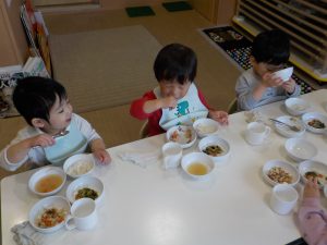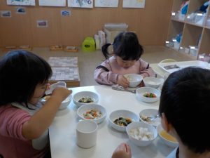 味噌や醤油を使った和風な味やケチャップやマヨネーズを使った洋風な味など、日頃給食で様々な味付けの食事が提供されていますが、子どもたちは味噌や醤油を使った和風の味付けの献立のほうを好む姿があります。食材では人参やかぼちゃ、しらす、きのこ類、納豆が好きなようで、好きな食材を食べることで美味しさに気付くと他の食材も食べ進める様子が見られることもあります。