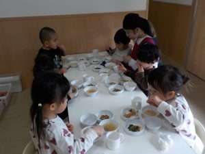 3月にはお楽しみ給食が予定されていることから、そら組では好きな給食についてやりとりをしました。各クラスで好まれる人参やかぼちゃの食材も挙がりましたが、うどん、しいたけ、玉ねぎ、さつまいも、豚肉等たくさんの食材の名前が出てきました。また、味噌やみりん、醤油などの調味料について話す子もいました。
