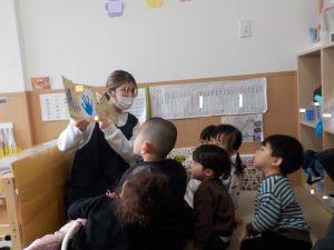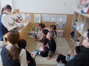 保育者からのプレゼントは「おおきなかぶ」の大型絵本です。初めて見る大きさの絵本に驚く様子が見られています。「うんとこしょどっこいしょ」のリズムに合わせて体を揺らしながら楽しんでいましたよ。最後、かぶが抜けると「よかったね」「うれしいね」と子どもたち同士でやりとりしています。
