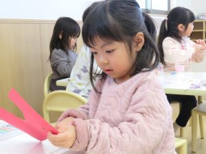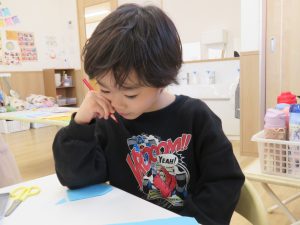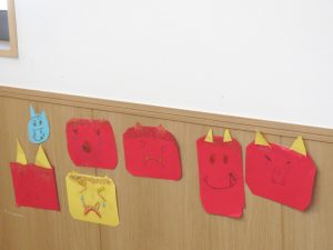 節分は「こわい鬼が来る日」ではなく、「みんなの心の中にいる鬼をやっつける日なんだよ」などと話すと、「泣き虫鬼いるかも」「片づけない鬼」と、自分のこととして考える姿が見られました。