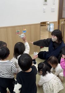 ひかり組(4歳児)でも、節分についてわかりやすく伝えるために「おなかのなかにおにがいる」という絵本を読みました。