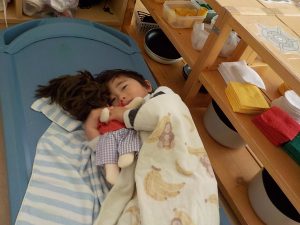 自分の大切な赤ちゃんと“一緒に寝たい”と午睡の時間に一緒にベッドに連れて行き眠る姿も見られています。睡眠中は窒息等を防ぐ為、子どもたちが寝ているベッドの側に移動しています。子どもたちの赤ちゃんを大切に思う気持ちに寄り添い関わっています。