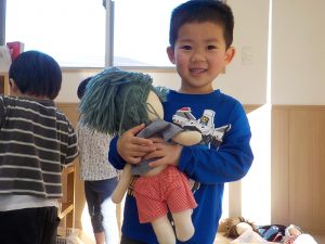 また、子どもたちは信頼できる大人との関わりの中で経験した、嬉しかったこと、心地良かったことを赤ちゃん人形を通して「おしっこ出たみたい。」「変えようか?スッキリしたね。」等伝えながら再現をしています。子どもたちの姿を見守り、時には「〇〇くんが熱出た時にはどうだったかな?」等経験を引き出せるような声掛けや、「どうしたらいいかな?」と一緒に悩み、考える関わりを行い、より豊かに表現出来るように今後も関わっていきたいと思います。