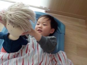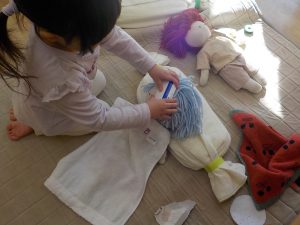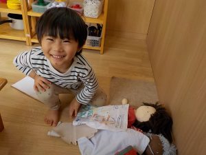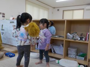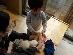 また、子どもたちは信頼できる大人との関わりの中で経験した、嬉しかったこと、心地良かったことを赤ちゃん人形を通して「おしっこ出たみたい。」「変えようか?スッキリしたね。」等伝えながら再現をしています。子どもたちの姿を見守り、時には「〇〇くんが熱出た時にはどうだったかな?」等経験を引き出せるような声掛けや、「どうしたらいいかな?」と一緒に悩み、考える関わりを行い、より豊かに表現出来るように今後も関わっていきたいと思います。