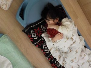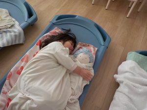 自分の大切な赤ちゃんと“一緒に寝たい”と午睡の時間に一緒にベッドに連れて行き眠る姿も見られています。睡眠中は窒息等を防ぐ為、子どもたちが寝ているベッドの側に移動しています。子どもたちの赤ちゃんを大切に思う気持ちに寄り添い関わっています。