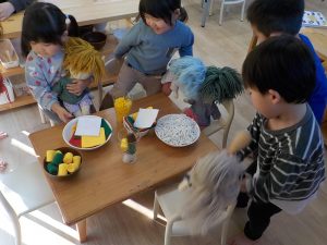 そら組の子どもたちは赤ちゃん人形を抱っこやおんぶしながら「お腹すいたの?」や「赤ちゃんが泣いてる!抱っこしてるからもう大丈夫だよ〜」等赤ちゃん人形の思いや表情をイメージして赤ちゃん人形に声を掛けながら関わる姿があります。進級当初は、今までも一緒に過ごしてきた“大切な自分の赤ちゃん”に他児が触れると“触らないで”と主張する姿も見られました。保育者がその気持ちに寄り添いながら「赤ちゃん寒そうだからお布団掛けてくれたのかな?」等、他児の思いも代弁することで、子どもたち同士でイメージを共有し「ご飯作るから、赤ちゃんを抱っこしていてくれる?」「いいよ、赤ちゃん眠いみたいね。」と役割分担しながら赤ちゃん人形に関わる姿も見られています。