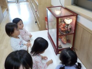 つき組(1歳児クラス)さんは、間近で見る日本人形ならではの表情に驚いたり、オルゴールの音色についうっとりしながら見つめる姿もありました。