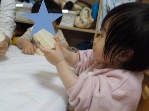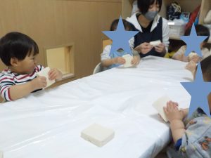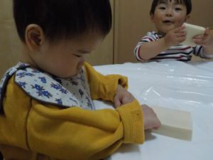 ほし組では廃材遊びに夢中になる姿が見られたので、高野豆腐を使った感触遊びを取り入れてみました。