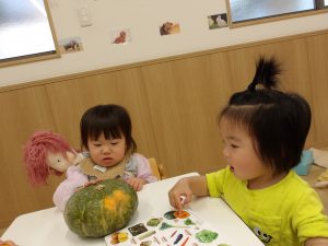 また、自分でやってみたいという意欲が高まってきています!お腹いっぱいで満足すると、ごちそうさまと手を合わせ、自らスタイを外したり、ガーゼで口を拭く姿も見られるようになってきています。着脱の時にはズボンに脚を入れたり、Tシャツを脱ごうと試行錯誤しています。思い通りにいかない時には、保育者に手伝ってとズボンを保育者の下に持って来て『やって』と伝えてくれます。