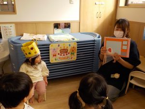前日の帰りの会の時に「明日は、〇〇ちゃんのお誕生会をするよ」と伝えていたこともあり、朝から「今日は、〇〇ちゃんのお誕生会だよね!」「〇〇ちゃん早く来ないかな」と楽しみにする姿がありました。誕生児の紹介では、「僕と同じ3才になったんだよね!」「みんな一緒、嬉しいね!」と嬉しい気持ちを共有していました。