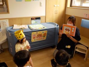 保育者からの出し物では、子どもたちがままごとで料理を作ったり、食べ物図鑑を読み料理に興味を持つ姿が多く見られていることから、スケッチブックシアター“魔法のレンジ”を行いました。魔法のレンジは食材をレンジの中に入れ数を数えると、その食材を使用した料理が出来上がります。子どもたちに「お誕生日の日には、何を食べるかな?」と聞くと「ケーキたべる!」とお話ししてくれる姿があったので、「ケーキの中には何が入ってるかな?」「何でできてるんだろう?」と尋ねて、皆で考えていきました。「トントントントンパカッとする食べものはなにかな?」「おやつの時に飲む白い飲み物は何かな?」等と子どもたちに問いかけやりとりをして、一緒に考えた食材をレンジの中に入れていきました。子どもたちと10秒数え、レンジの中からケーキが出て来ると「ケーキだ!!」「おいしそう!」と嬉しそうな様子がありました。午後のおやつにもケーキが出ることを伝えると、とても楽しみにしていました。
