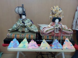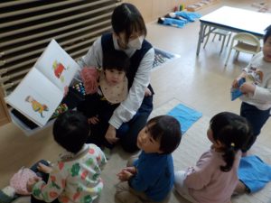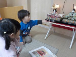 「和の行事えほん」のひな祭りのページを見ながらやりとりを行いました。何をするの日かやお内裏様とお雛様についてやりとりするだけでなく、三人官女、吊るし飾り等に興味を持ち「これはなに?どうして飾るの?」と疑問を共有しています。ひな人形の顔が白いこと、髪の毛が長いこと等に気付き、興味津々で見ています。