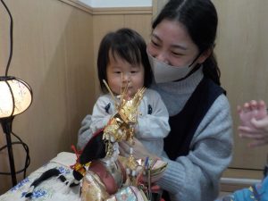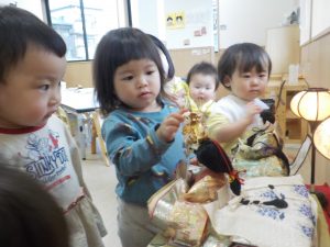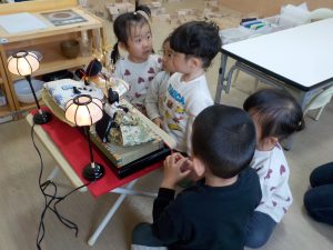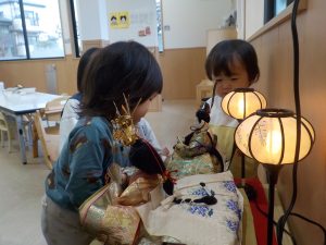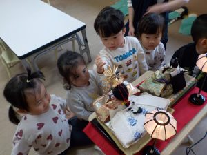 ほし組では、ぼんぼりの電気をつけると目を輝かせ、”きれい”と感じている表情を見せていました。着物や髪飾りの豪華さにも興味を持つ姿も見られています。『大事な物』と子どもたちも感じたようで、そっと指先で触れる様子がありました。
