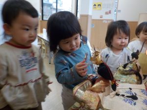 つき組でも、保育者の話に耳を傾ける中でひな人形が大切な物であることを理解する姿がありました。保育者と一緒に着物を何枚着ているか数えたり、烏帽子や扇などを身に付けていることに気付いたりしています。