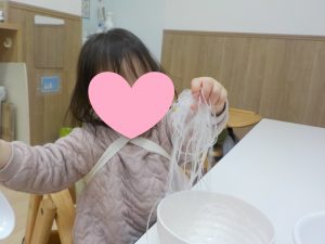 春雨を使った感触遊びでは、触れてみるところから始まり、次第に容器やスプーンを準備して移し替えてみたり、自分なりに試行錯誤しながら五感を使って集中して遊んでいました。