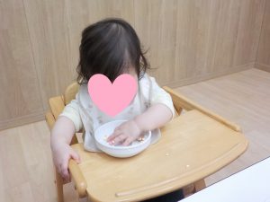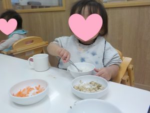 “自分でやってみたい”気持ちが大きい中、上手くすくえない時には保育者にスプーンを渡して助けを求め、やりとりの中で楽しく食事をしていました。