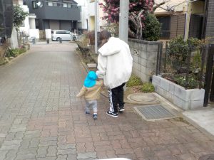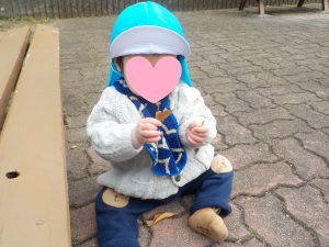 また、歩行が安定してきた子は時々保育者と手を繋いで歩いています。興味のある所へ行ったり、石や葉っぱを見つけると大事に握りしめながら帰ります。