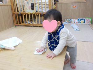 保育者の模倣が盛んになってきた子どもたちは、普段保育者が行っている食事の準備なども遊びに組み込んでいます。最近はフェルトを布巾に見立て、テーブルなどを拭く真似を遊びに取り入れ、楽しんでいます。
