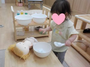 今まで自分がしてもらった心地よい経験を自分もしてみたいという、”自己実現欲求”を満たすため。また、赤ちゃん人形のお世話を通して”自分はこんなに大切にされていたんだ”と自己肯定感を育むために設置しています。