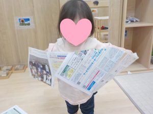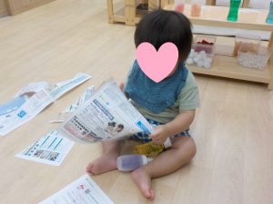 紙遊びでは、最初は”なんだろう”と不思議そうな表情を浮かべつつ手に取り、保育者と一緒に破いてみると、破れる様子や音に面白さを感じ興味を持つように。繰り返し行う中で自分でやってみようと挑戦しますが、上手くできないと保育者に助けを求めていました。切れ込みを入れると”自分でできた!”と嬉しそうな表情を浮かべていましたよ。