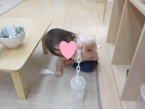 興味のある物を手に取り、舐めて確かめたり音を鳴らしてみたりと物にじっくりと親しんだあとは、指先の発達と共に、中に入れてみる、スプーンでかき混ぜる、容器から容器へ移し返す等、段階を踏んで遊び方の変化も見られています。保育者が遊ぶ姿を見て模倣しようとする姿もありますね。