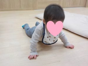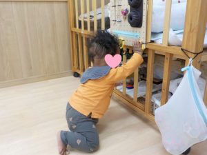 お座りができるようになったり手離しで立つことができると、子どもたちも嬉しそうに視線を合わせニコッと微笑み、感動でいっぱいな瞬間でした。様々な体勢が経験できるよう、環境を整え、安全に配慮しながら見守っています。