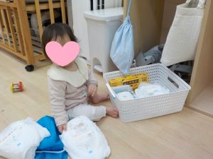 探索する中で自分のロッカーを見つけるとオムツや袋、中に入っているものを引っ張り出したりと確かめる姿もありましたね。