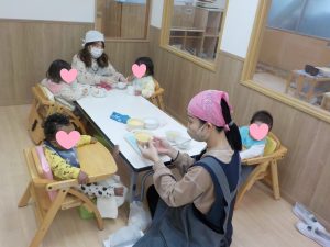 「おいしいね」と食事中の心地よい関わりを、遊びの中で再現する子も増えてきました。