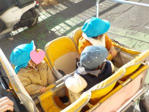 戸外活動では、周囲の様子に興味を持ってカートから覗き込んだり、キョロキョロと周りを見渡しています。
