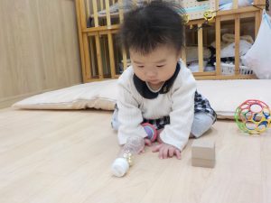 初めて保護者と離れて過ごすことに不安を感じる姿がありましたが、保育者に不安な気持ちや生理的欲求を受け止めてもらううちに、少しずつ担任保育者との関係を築いていき、笑顔や安心した表情も増え、探索活動も活発になりました。