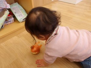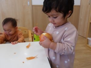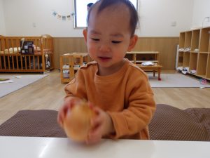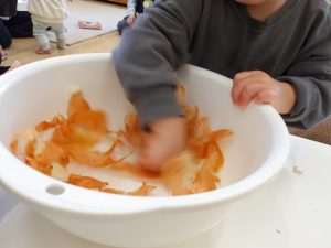 ボウルの中で皮を回して感触や音を楽しむ姿が見られ、1つの食材から子ども達なりに感じることが沢山あるのだなと