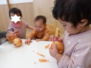 皮が付いた状態で自ら触れてみたり、お友だちや保育者の様子を伺う姿が見られました。