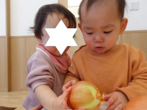 玉ねぎをテーブルに出すと、興味を示し子ども達が集まってきました。