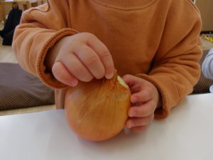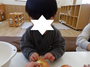 今月のほし組の食育活動は玉ねぎの皮むきを行いました。