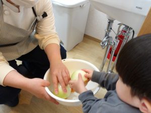 伝えているような反応が見られたり、剥くのが難しくなると保育者をトントンと叩き