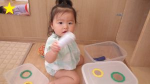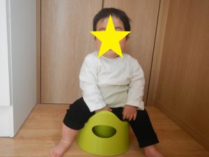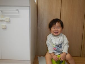 お部屋にあるオマルに興味をもち、オムツ交換の時だけでなく座ってみることもしています。
