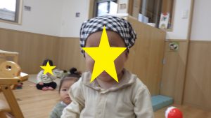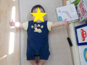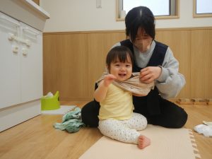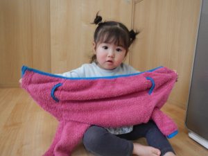 頭や手、足を通すことを声掛けしながら行うと頭や手、足が出てきた時に笑顔を見せていました。