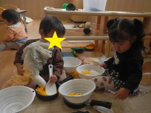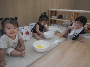 入園時期がそれぞれ違い、一人ひとりの生活リズムに応じて欲求を満たし安心した環境の中で過ごせるよう
