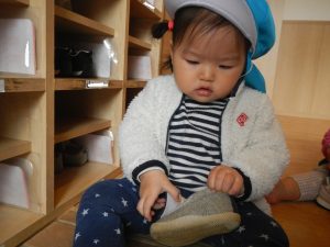 着替えの時は巾着袋から自分で洋服を出してみる様子があり、着たい服を選んだり、ズボンを履いてみようとしています。