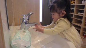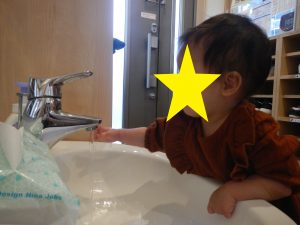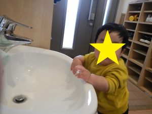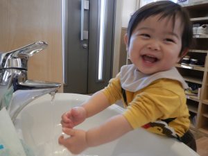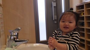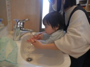 食事の時間になり、手を洗いに行くことを誘うと進んで保育者と向かう姿があり、