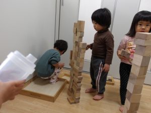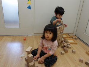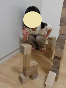 丈夫な建物の構造等を遊びながら自分たちで考えて知ることが出来たり、何人かで作る時は協力し合い人とのコミュニケーションが必要でもあり、イメージしたものを実現する達成感などいろいろな力を育むことが出来る積み木遊び。これからも十分なスペースを確保しながら子ども達と一緒に楽しんでいきたいと思います!