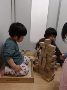 0歳児クラスの時から触れられるように設置し0、1歳児クラスでは積み木の感触を味わったり、打ち付けて音を楽しんだり平面で並べてみたりと様々な遊びをして積み木がどんな物なのかを試しています。保育者は子どもの実験、研究が満足いくまで見守りつつ音や感触の共感を丁寧に行っていきます。