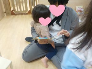 いつもと違う雰囲気を感じ取り、保護者にくっつき安心を求めながら参加する誕生児。