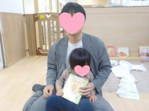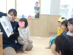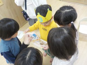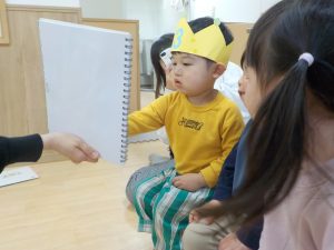 アイスのブックシアターを行いました。前日の夕方に誕生日会があることを伝えていたので期待を膨らませながら当日を迎え、どこでやるのか場所も伝えておくと、自分たちでイスを準備して座って始まるのを楽しみに待っていました。